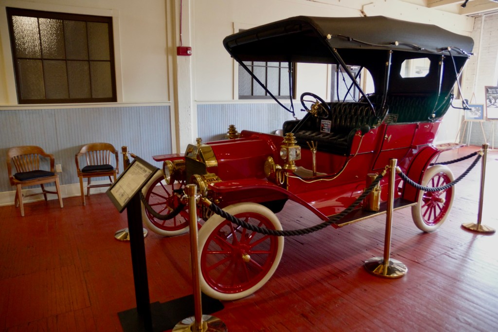 Inne i bygningen står flere biler på utstilling, blant annet denne flotte, røde T-Forden. Det er veldig sjarmerende å gå rundt i det gamle bygget som fortsatt har knirkende tregulv. Man kan nesten se for seg hektiske dager med produksjon av biler i lokalene.