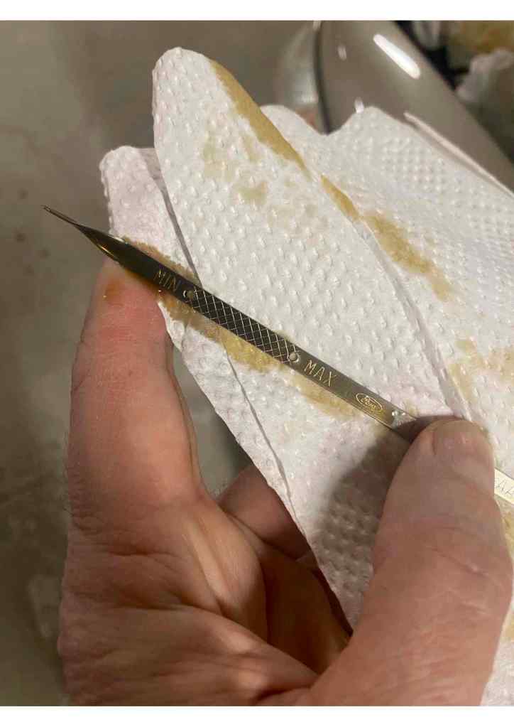 Etter å ha fylt på 3 liter olje, og noen minutter med venting, kunne vi klart se den nye oljen på peilepinnen. Vi stoppet på 3,5 liter da oljen traff akkurat makspunktet på peilepinnen. Antakelig lå det fortsatt litt olje igjen i bunnpanna.