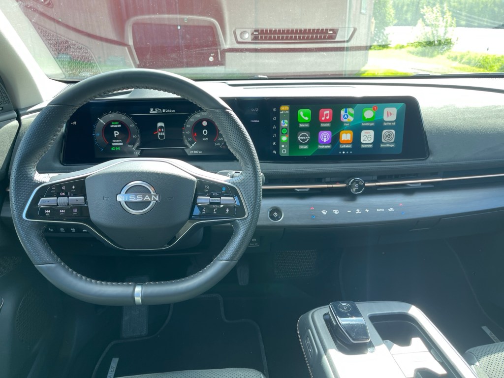 På veien oppfører bilen seg godt. Den liker å bli presset litt ekstra på svingete veier, og henger med selv når veiene er regnvåte. Ariya er veldig godt støydempet, noe som bl.a. kan tilskrivesde doble sidevinduene. Testbilen vår har den største batteripakken, og med det kjennes akselerasjonen svært rask. Jeg tar meg selv i å tenke at denne bilen faktisk går ganske fælt.
