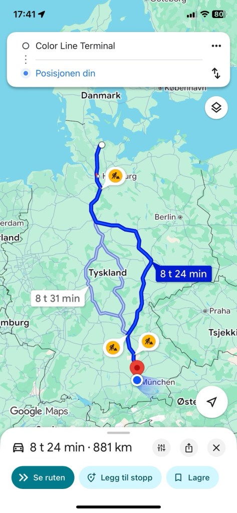 Vi endte opp i München etter tett på 90 mil. En del veiarbeider særlig i nord gjorde at vi ble en del forsinket. Men med hele ferien foran seg og ikke noe spesielt å rekke, er det bare å roe ned og ta tingene som de kommer.