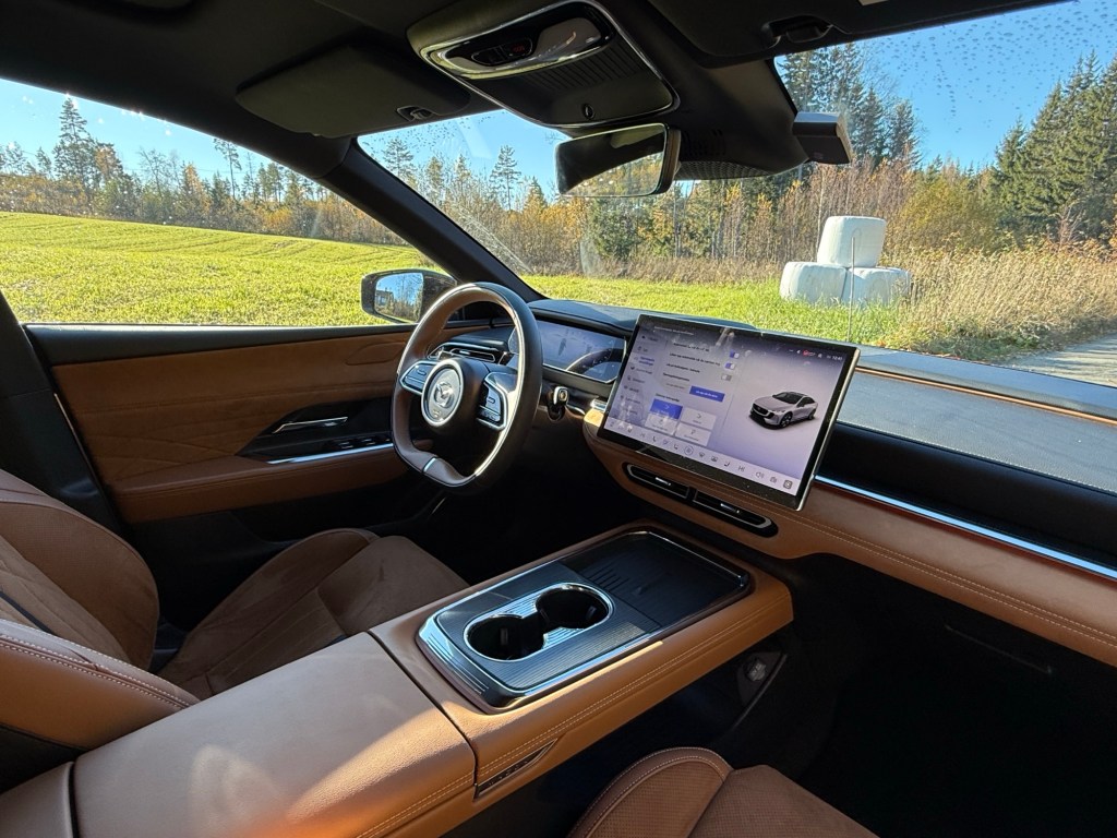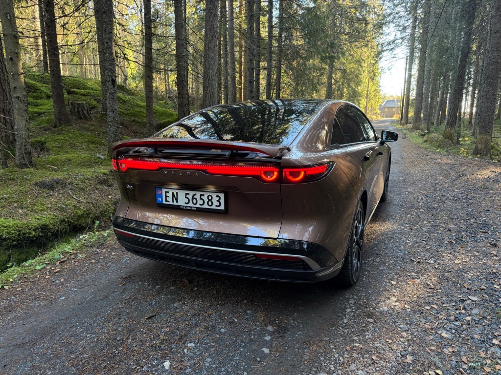 Mazda 6e har også lagt vekt på små detaljer du først legger merke til etter noen dager bak rattet. Talestyringen fungerer overraskende godt – så lenge du lærer deg kommandoene – og den lille spoileren på bakluken gir ikke bare bilen et sportslig løft, den hever og senker seg også med farten. Når du nærmer deg bilen, kan den til og med vippe seg opp som en liten hilsen. Slike små ting gjør at bilen føles gjennomtenkt. Og når du låser og lukker den opp i mørket, hilser velkomstlysene deg på en måte som både ser kult ut og gir et lite smil før du setter deg inn.