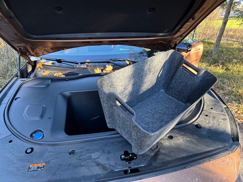 Er du opptatt av bagasjeplass, må du derimot senke forventningene litt. Mazda 6e har 336 liter bagasjeplass med baksetene oppe, men legger du ned det 40/20/40-delte baksetet får du hele 1 074 liter å boltre deg på. Rommet er dypt, men høyden spises litt opp av den store, elegante bakluken – et kompromiss mange nok vil tilgi, gitt hvor elegant helheten er. Til gjengjeld får du en 72-liters frunk under panseret, som er overraskende romslig og praktisk. Mazda tilbyr også en egen innsats her, som gjør det enkelt å sette inn og ta ut for eksempel handleposer eller varer fra butikken. Et lite, men smart grep som faktisk gjør hverdagen enklere.