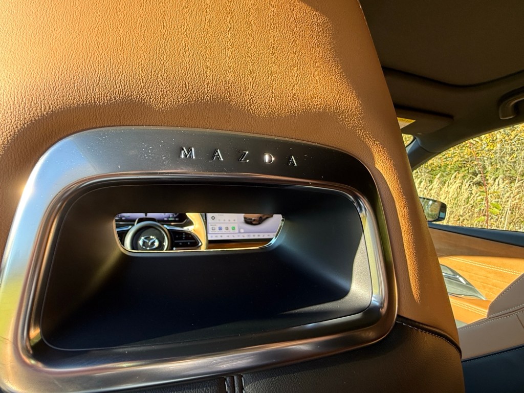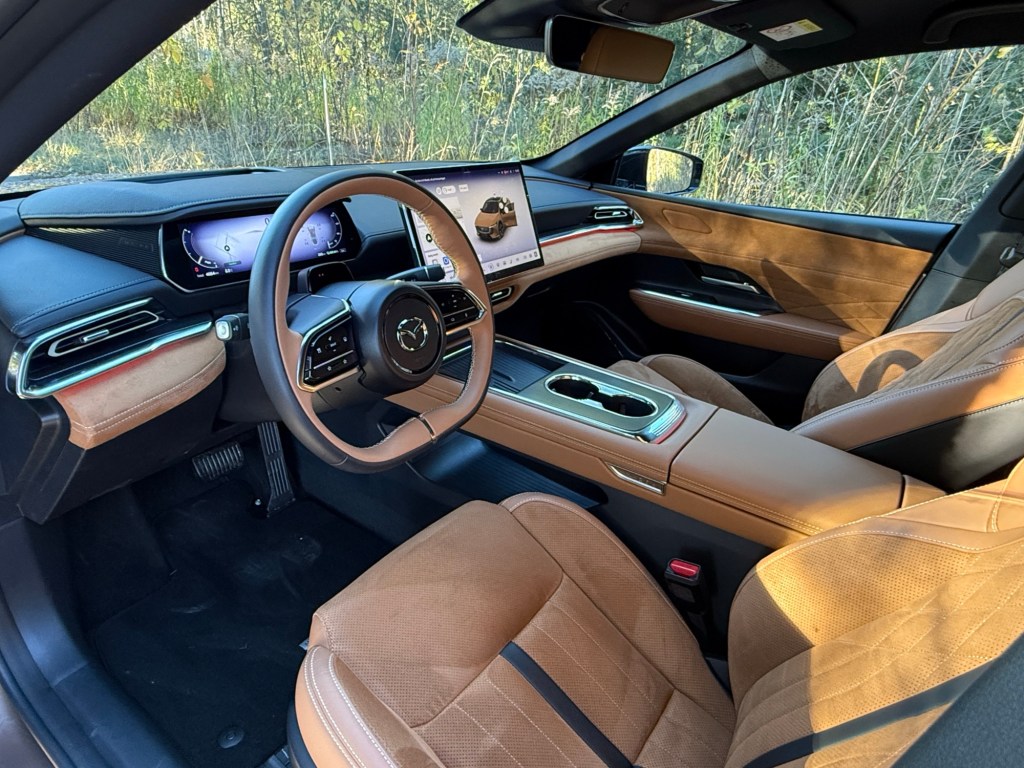 Setene fortjener ros. De kombinerer skinn og alcantara på en måte som både ser ut og føles eksklusivt. Skinnet er mykt og solid, detaljene i krom gir en klassisk luksusfølelse, og Mazda har til og med valgt å prege små logoer inn i interiøret som prikken over i-en. Designet på selve setene minner om japanske bilseter fra 70-tallet – med nakkestøtter som glir sømløst inn i seteryggen, pakket inn i et moderne uttrykk. Det store glasstaket forsterker den luftige følelsen i kupeen, og det er ikke bare til pynt: det kan faktisk åpnes, noe som gir en deilig bris på varme dager.