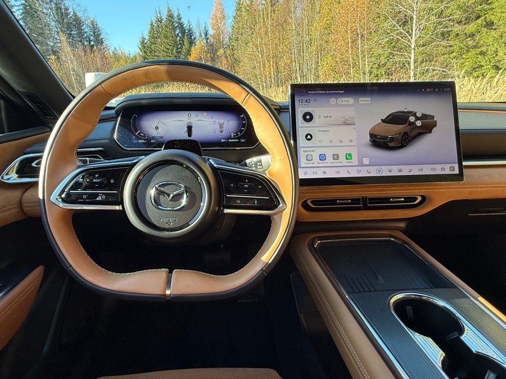 Som på de fleste moderne biler ligger alt av innstillinger og menyer på midtskjermen, og Mazda sitt system er både ryddig og fleksibelt. Her kan du lage egne snarveier og sette opp skjermvisninger akkurat slik du vil ha dem. Litt vel mange valgmuligheter, kanskje, men for de som liker å tilpasse alt mulig, er dette et paradis.